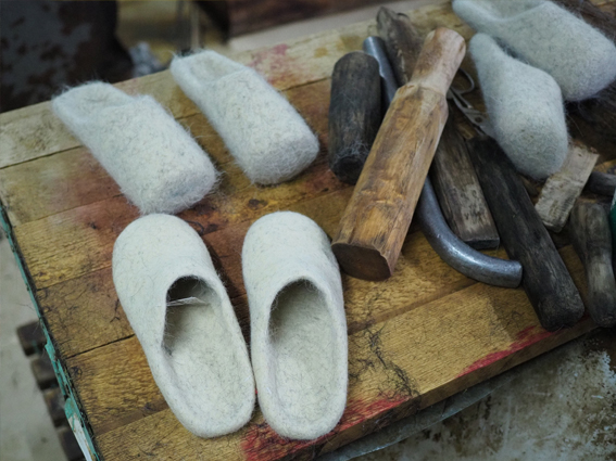 Процесс валяния из натуральной шерсти очень трудоемкий. Чтобы получить красивые белые тапочки или валенки, нужно сначала заложить форму из непромытой шерсти, потом несколько раз в процессе работы простирать изделие в большом количестве воды, чтобы изделия были чистыми.